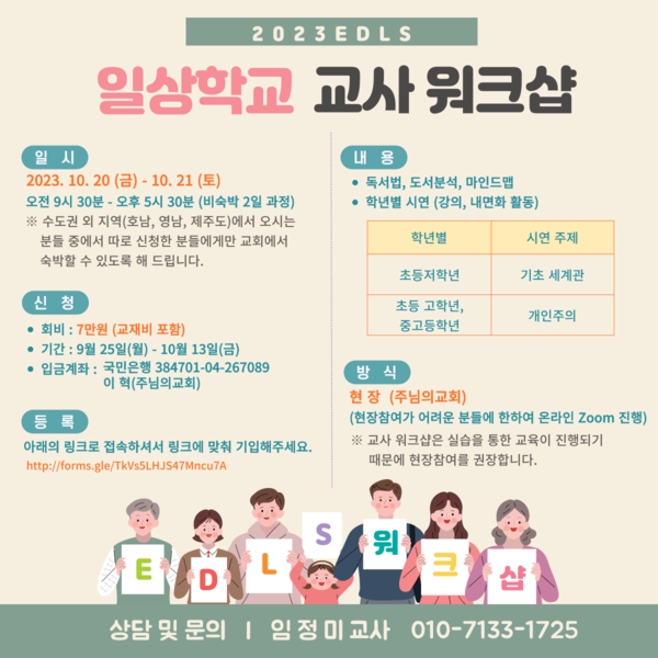 일상학교(EDLS)가 10월 20일(금)-21(토)까지 서울 강서구 소재 주님의교회(이혁 목사)에서 [2023년 교사 워크샵]을 개최한다.